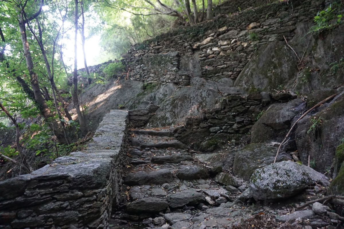 Entlang des Bachlaufes führt der Weg entlang von Weinbergen durch das Tal der Mühlen, bevor er auf einem in Serpentinen angelegten Maultierweg zügig in die Höhe zieht. Das Rauschen des Baches, dessen Farbe zwischen Blau und Grün wechselt, begleitet uns. Von der ersten Höhenstufe eröffnet sich ein wunderbarer Blick in das tief gelegene Etschtal und auf die gegenüberliegende Bergwelt.