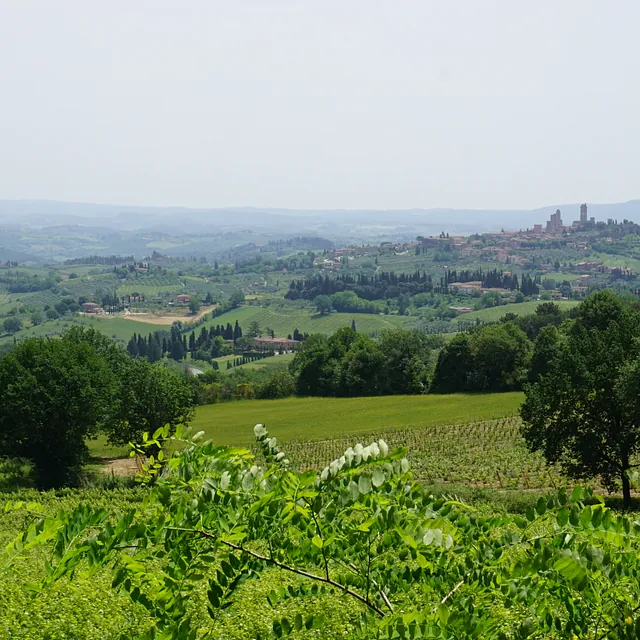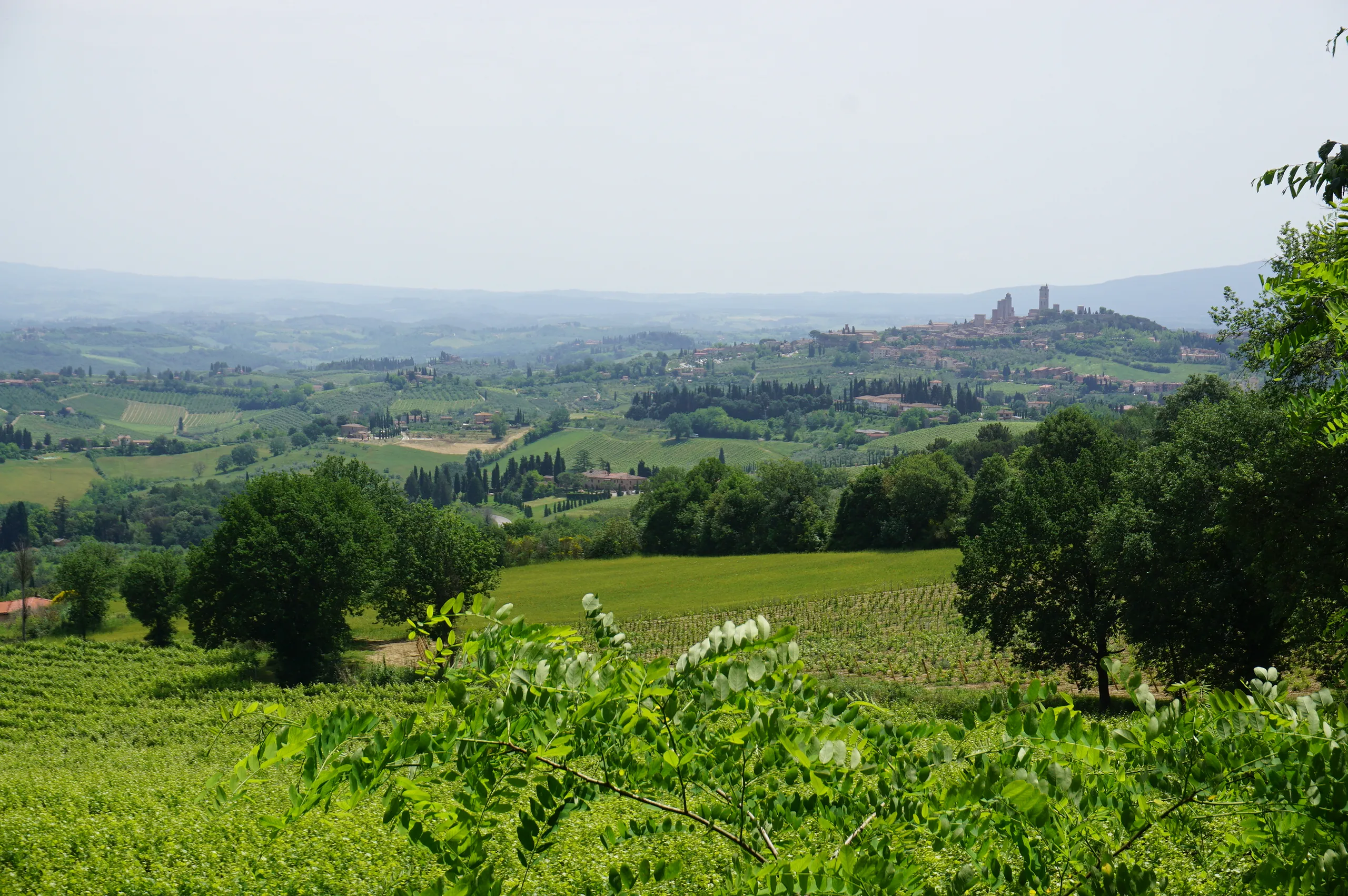 Wir folgen einem aussichtsreichen Kammweg, der uns herrliche Blicke auf die toskanische Hügellandschaft schenkt. Sanft führt der Weg hinunter zum Flüsschen Aqua Calda, das hier die Grenze zwischen den Provinzen Florenz und Siena markiert. Die Landschaft ringsum wirkt wie ein lebendiges Mosaik: Felder, Weinreben, Olivenhaine und kleine Gehöfte wechseln sich ab. Am Wegesrand begegnen uns Kapellen, schmucke Bauernhäuser und Villen — stille Zeugen einer langen landwirtschaftlichen Tradition. Unser Weg führt uns weiter bis nach Cellole, einem kleinen, stillen Kloster mit romanischer Kirche, das uns einen Moment der Einkehr schenkt. Von hier ist es nicht mehr weit bis zu unserem Etappenziel: San Gimignano, die mittelalterliche Stadt mit ihren berühmten